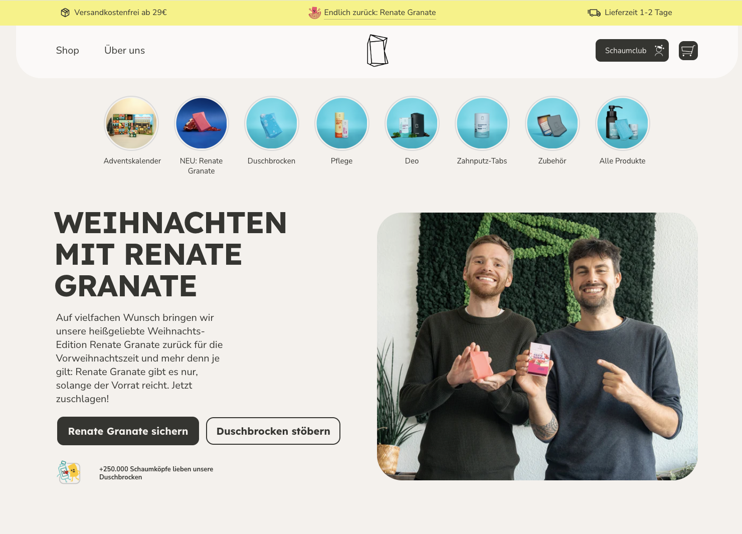 Was mit einem einzelnen Produkt begann, ist heute ein breites Sortiment. Duschbrocken bietet mittlerweile die gesamte Bandbreite für plastikfreie Pflege – vom Original-Duschbrocken über Gesichtspflege bis hin zu saisonalen Produkten. Die größte Entwicklung? Der Adventskalender, der zum absoluten Gamechanger wurde.