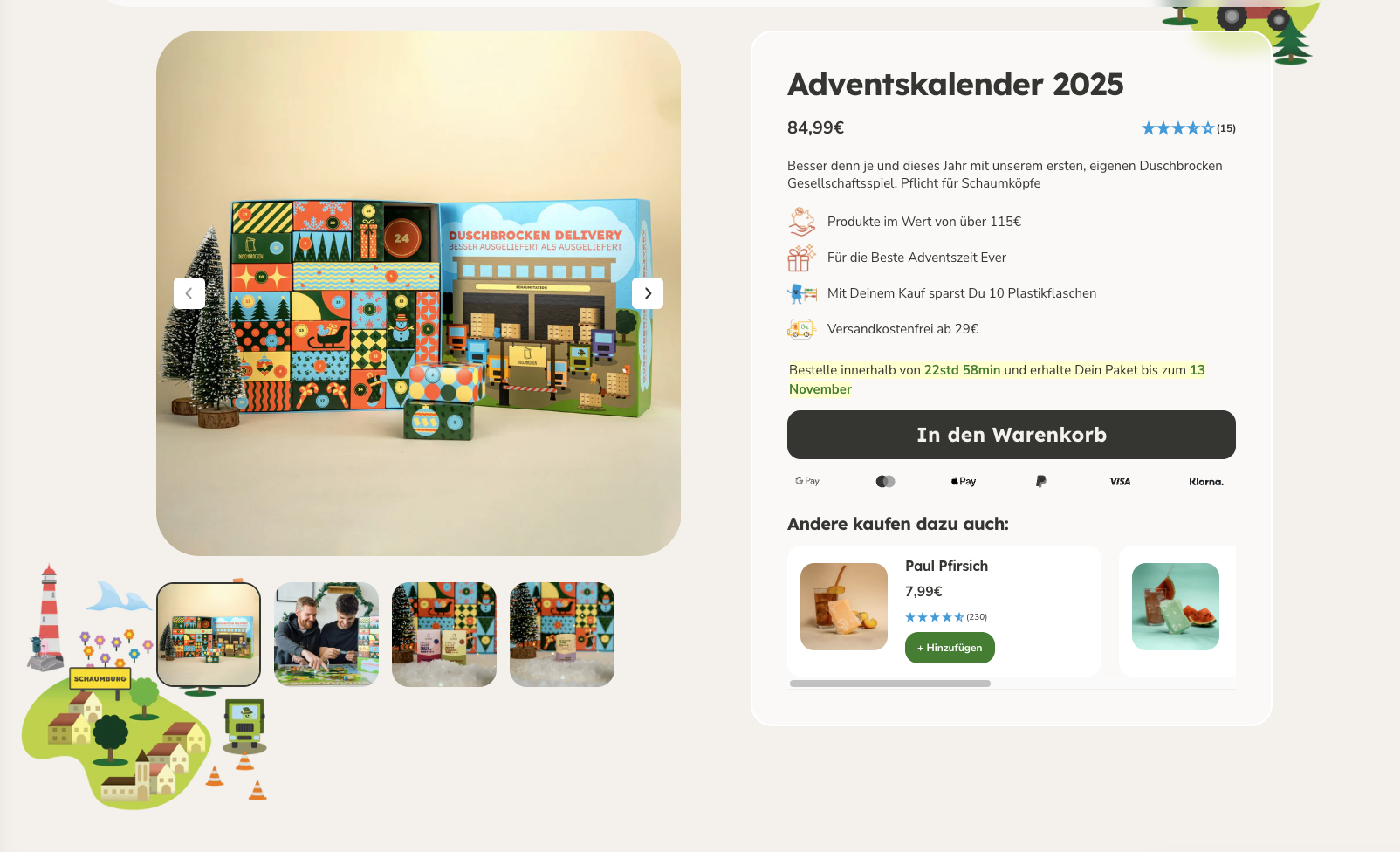 Duschbrocken setzt auf ein klassisches D2C-Modell: Produkte werden direkt über die eigene Website verkauft. Das Original-Produkt – festes Shampoo und Duschgel kombiniert – bildet das Fundament. Doch der wahre Star ist der Adventskalender. Seit vier Jahren bringt Duschbrocken jedes Jahr einen Adventskalender heraus, und der Launch-Zeitpunkt ist ungewöhnlich: der 31. August.