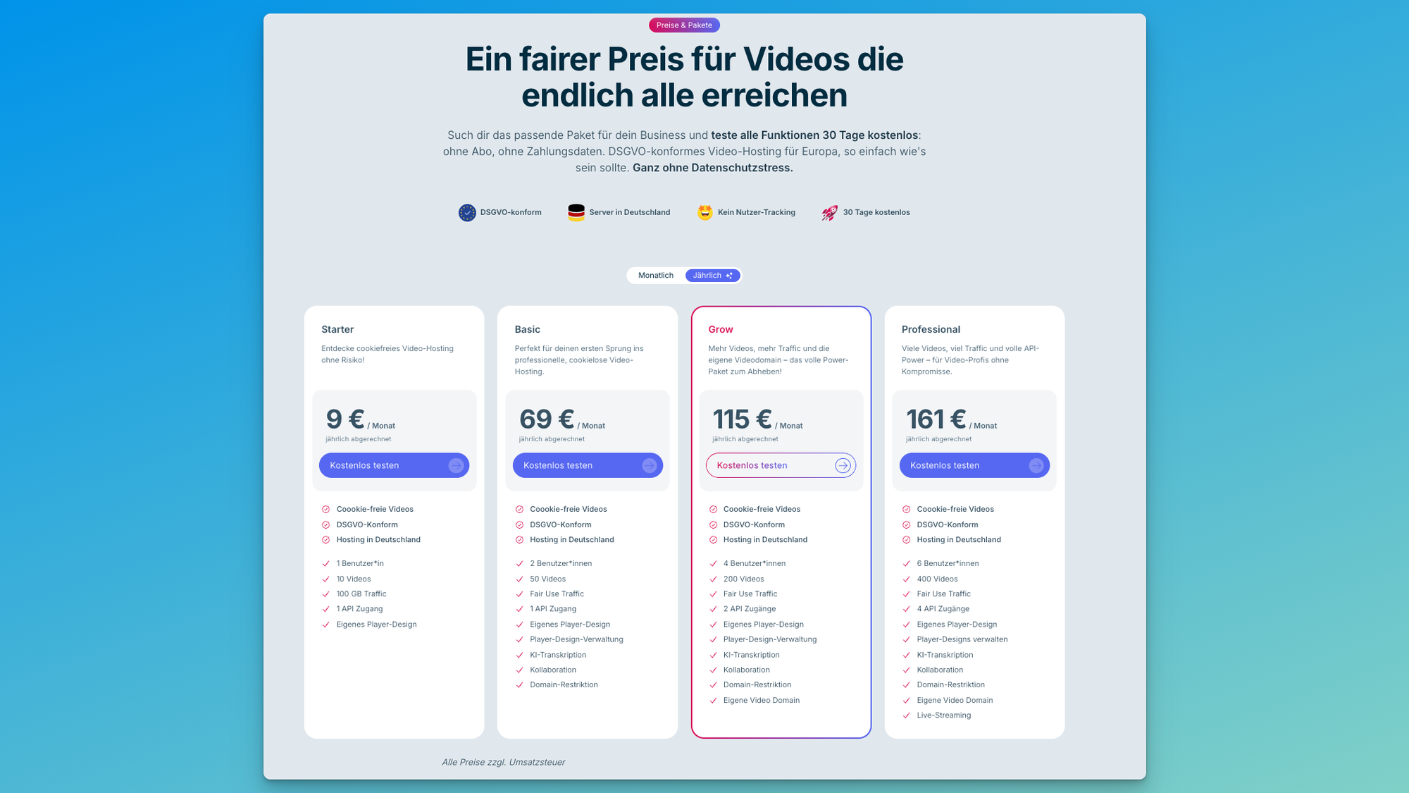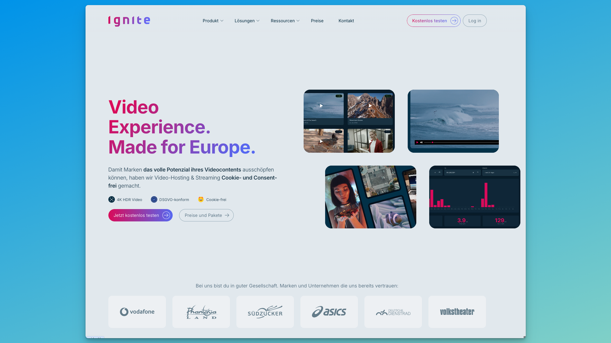 Ignite Video positioniert sich als europäische Alternative zu etablierten Anbietern wie Vimeo. Das Startup bietet verschiedene Preispakete an, beginnend bei 15€ monatlich für das Starter-Paket mit 10 Videos und 100GB Traffic. Die Enterprise-Pakete richten sich an größere Kunden wie Vodafone, die die Plattform über APIs in ihre eigenen Systeme integrieren.