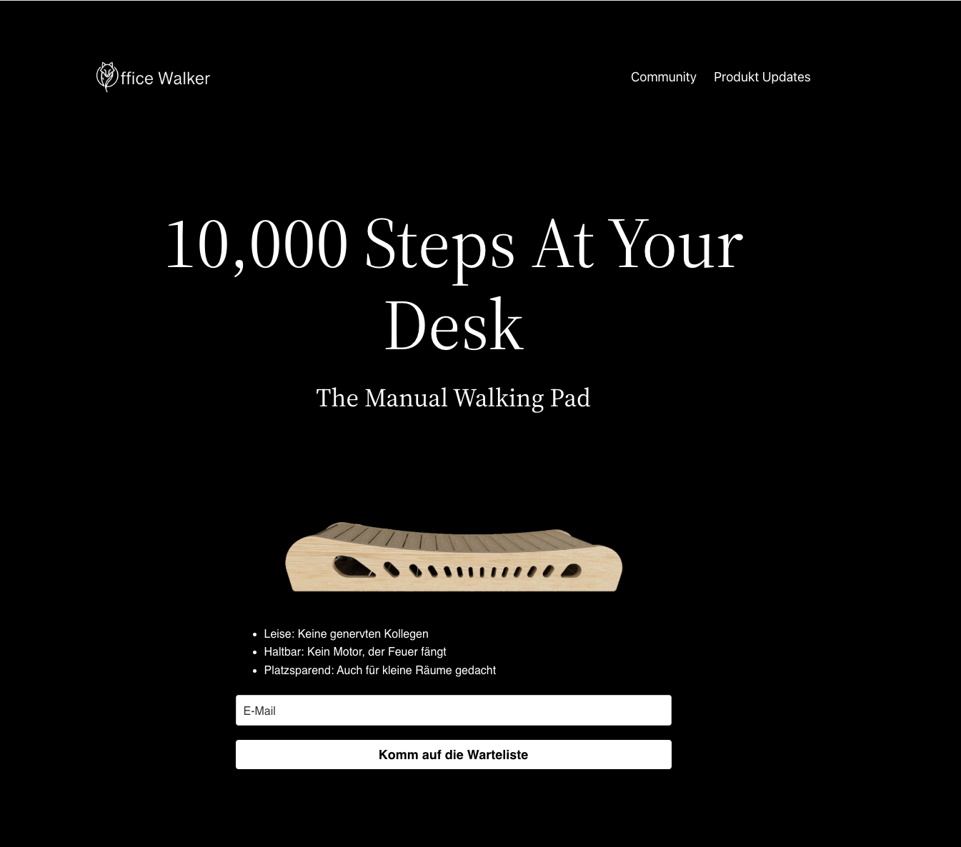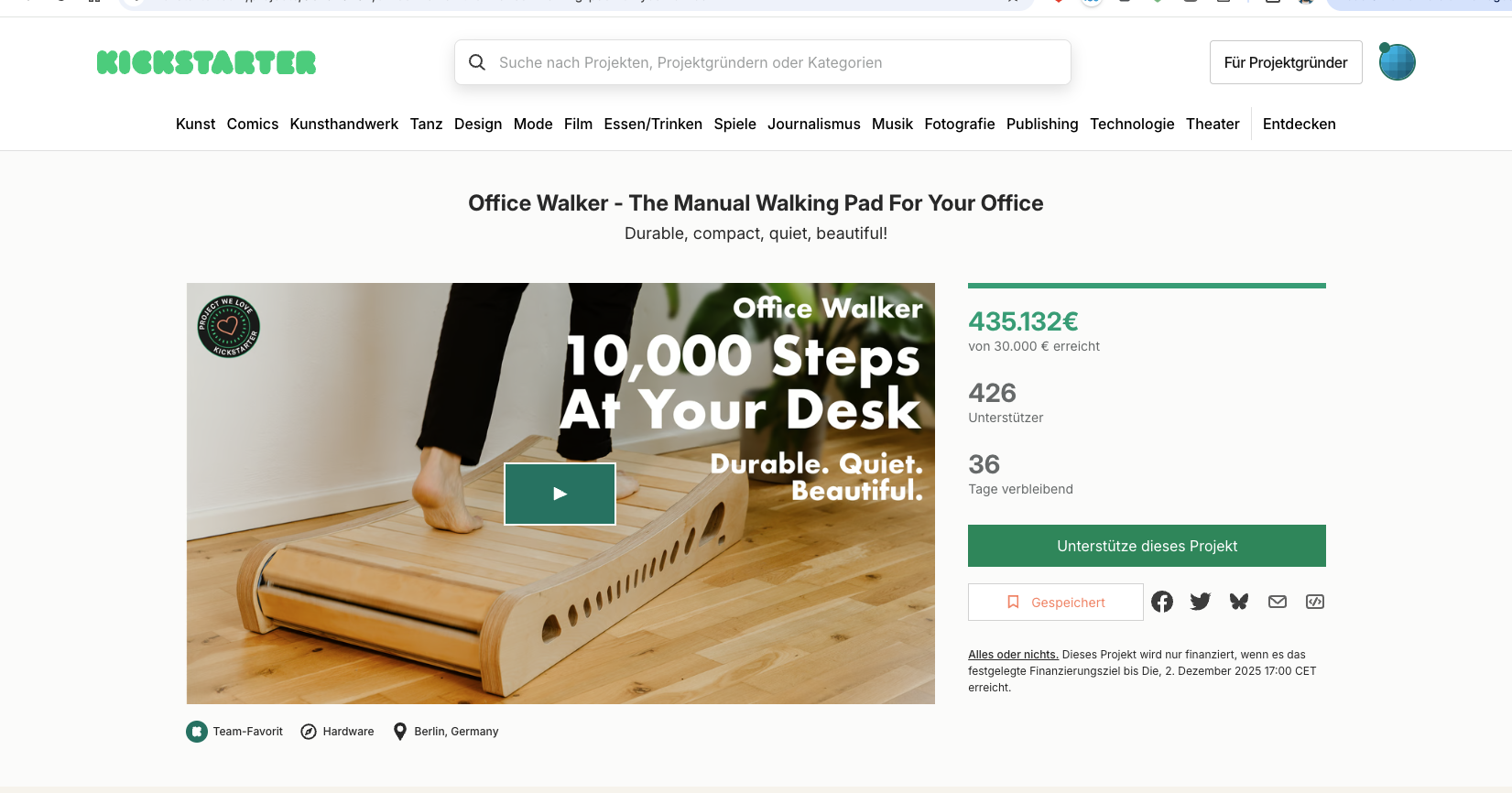Seine Lösung: Walking Pads. Doch nach drei defekten elektrischen Laufbändern in zwei Jahren und 1.000 Euro Verlust entwickelt der Physiker und Softwareentwickler jetzt sein eigenes mechanisches Walking Pad – den Office Walker. Seine Kickstarter-Kampagne ist bereits ein Erfolg: Über 400.000 Euro wurden bisher gesammelt.