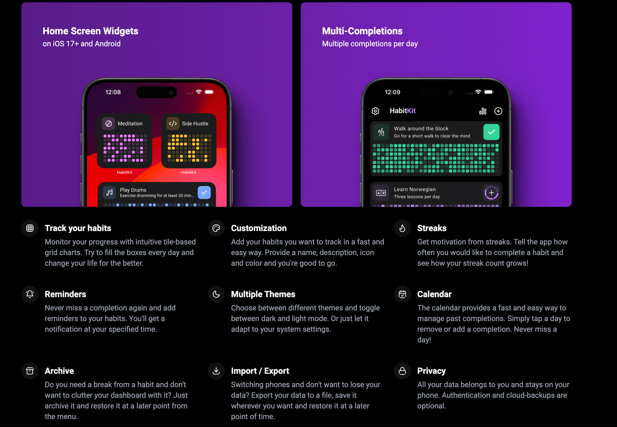 Das Kernfeature von HabitKit unterscheidet sich von Konkurrenz-Apps wie Streaks durch seine visuelle Darstellung. Statt nur eine Zahl für die Streak-Tage anzuzeigen, bietet Sebastian eine Kalenderansicht im Kachel-Format – ähnlich dem GitHub Contribution Graph, aber mit Icons und Farben. "Ich wollte ein etwas größeres Bild meiner Konsistenz", erklärt er seine Motivation.