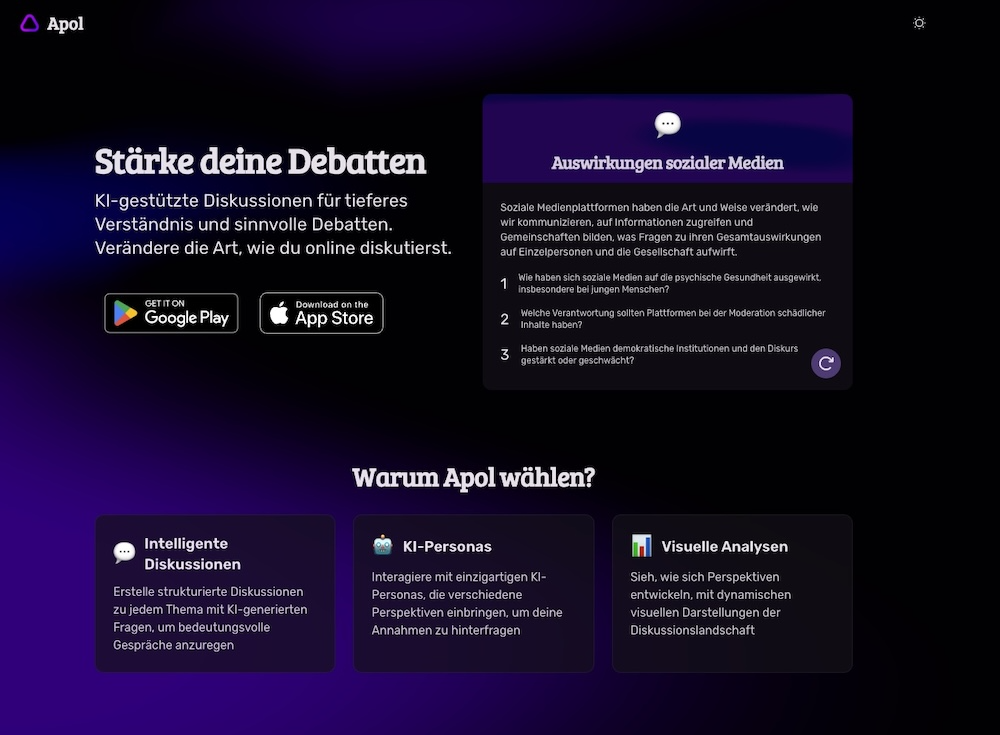 Die zweite App heißt Apol – Kurzform für „apolar". Der Ansatz klingt auf den ersten Blick abstrakt: Nutzer geben eine These ein, und KI-Personas diskutieren aus unterschiedlichen Perspektiven darüber. Man könnte das für ein Nischenexperiment halten, das in einer deutschen Tech-Blase versandet.