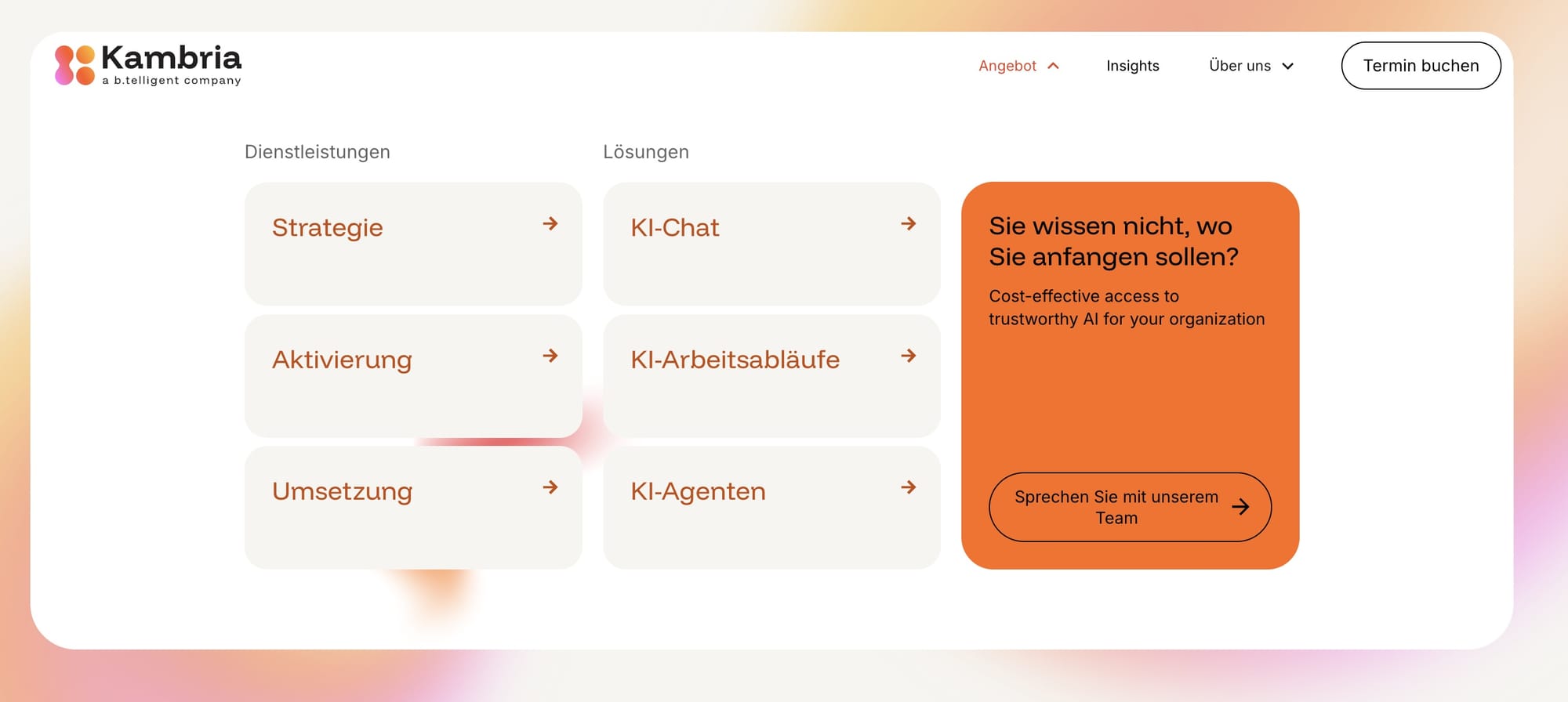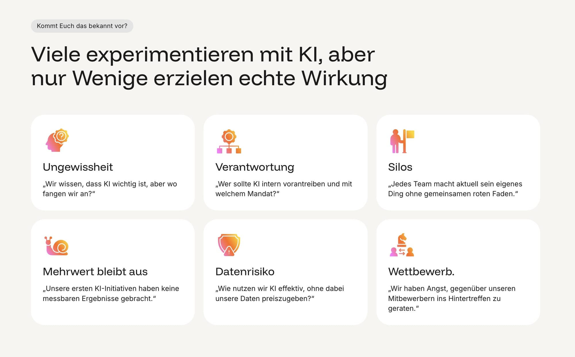 Silvano beschreibt das als eines der zentralen Spannungsfelder seiner Arbeit. Wer 150.000 Euro für Co-Pilot-Lizenzen ausgibt, ohne vorher zu klären, wie die Leute damit arbeiten sollen, landet drei Monate später mit ungenutzten Lizenzen. Kambria geht deshalb nicht mit Rollouts rein, sondern mit Fragen: Was machen die Leute gerade? Wo verlieren sie Zeit? Wo steckt das erste sinnvolle Anwendungsfeld?