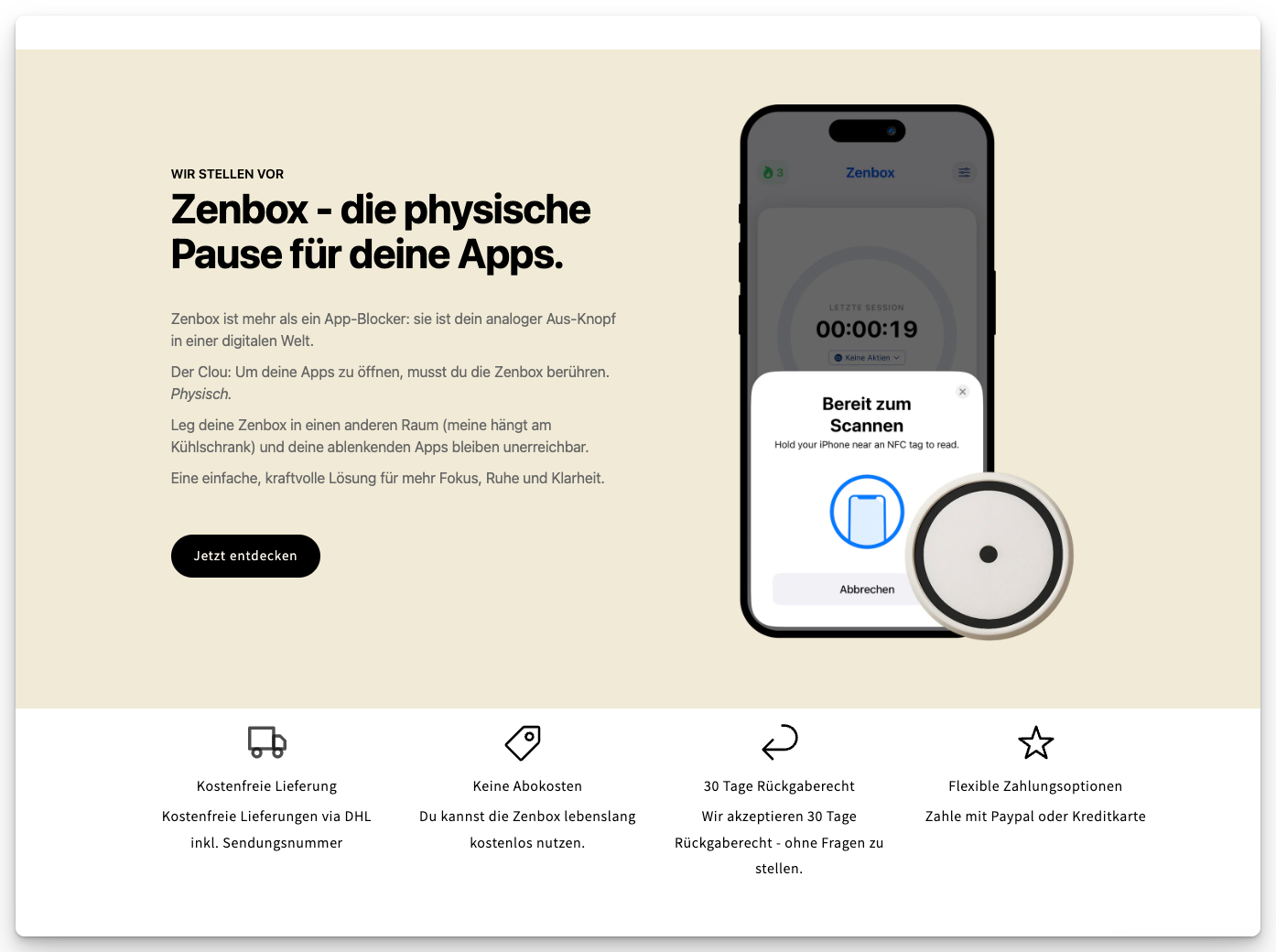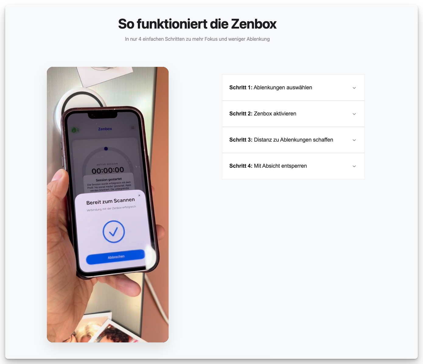 Zenbox ist ein physisches Device (49,90 Euro), das mit einer iOS-App zusammenarbeitet. User wählen Apps, die sie blocken wollen, und aktivieren den Block durch Berühren des Devices. Ohne das Device können die Apps nicht entsperrt werden – physische Distanz als Hürde.